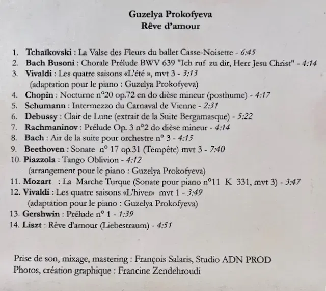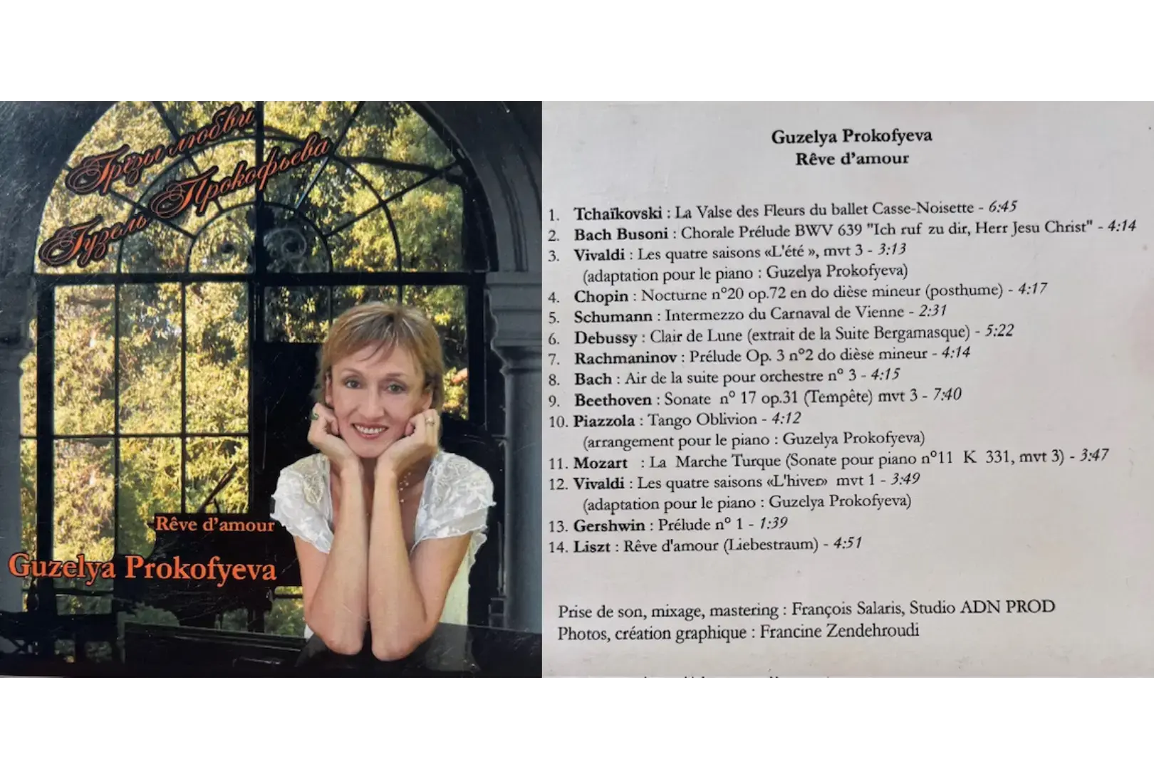 Le disque de Guzelya Prokofyeva "Rêve d'amour" est sorti avec des oeuvres des compositeurs comme Rachmaninoff, Tchaikovsky, Chopin, Mozart, Piazzola ...